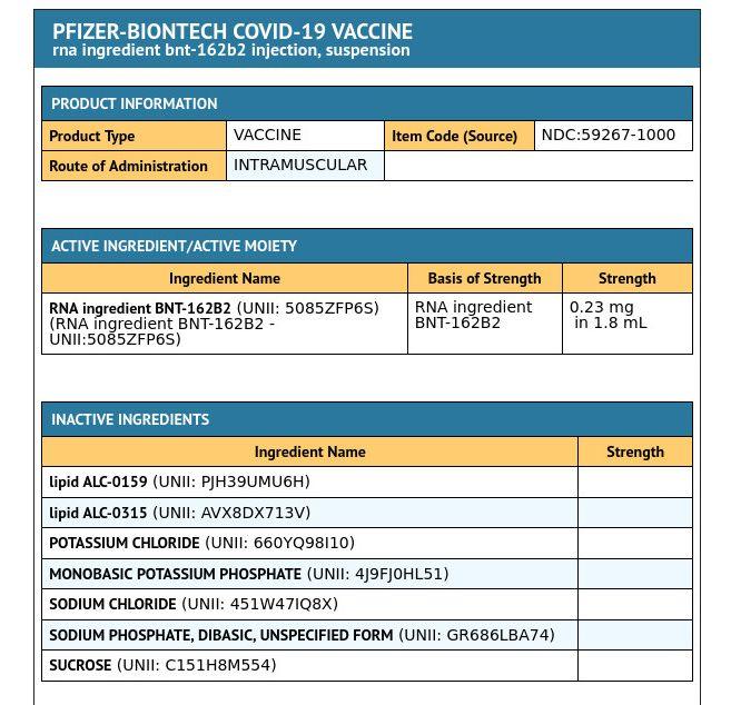 Health Canada listed the ingredients contained in the vaccine which were oulined in a CTV News article entitled Health Canada warns people with allergies to Pfizer COVID-19 vaccine ingredients to not get it. Now isn’t that reassuring…