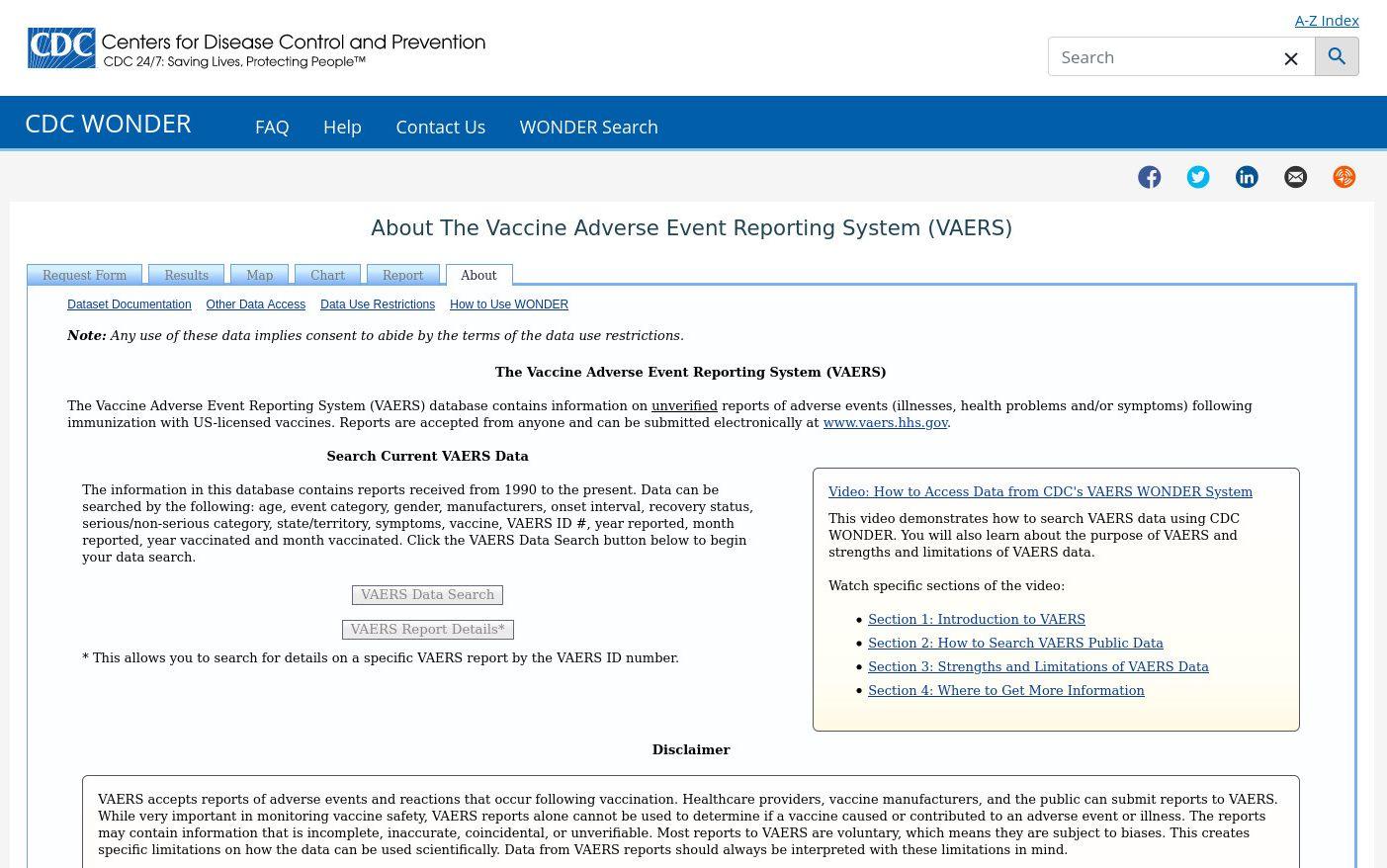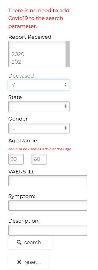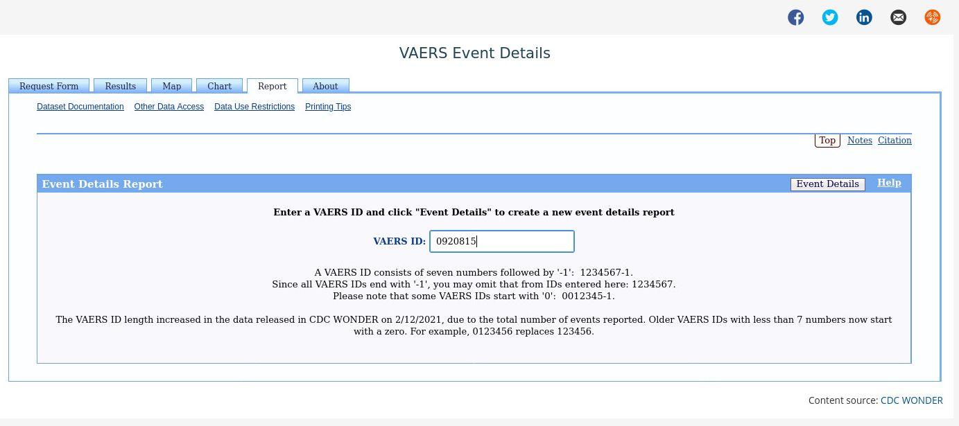 Now the next step is optional if you wish to see the actual CDC VAERS data. Simple jot down the VAERS ID and flip over to the CDC web site CDC WONDER. At the bottom of the list is the link Vaccine Adverse Event Reporting. Select this link and you will be brought to the search page where you can look up the information.