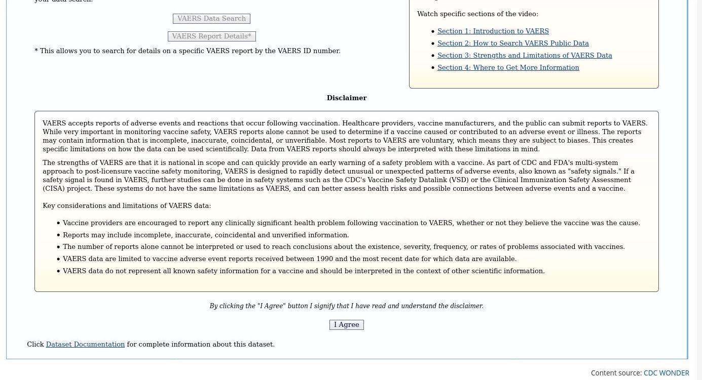 In the middle of the page will be the VAERS Report Details* button. Before you can select it, you have to Agree to the disclaimer using the I Agree button at the bottom of the disclaimer: