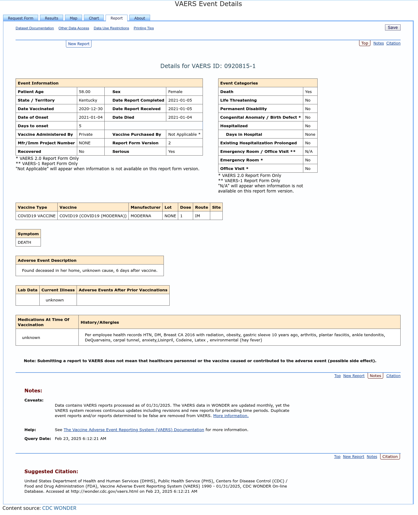 From here you’ll get the following page where you can enter the VAERS ID that you jotted down. You will get a warning if you do not precede the ID with a leading zero. So I am going to enter VAERS ID 920815 like this 0920815 and then select the Event Details button just above and to the right of the entry box. Afterwards the data below will be returned.