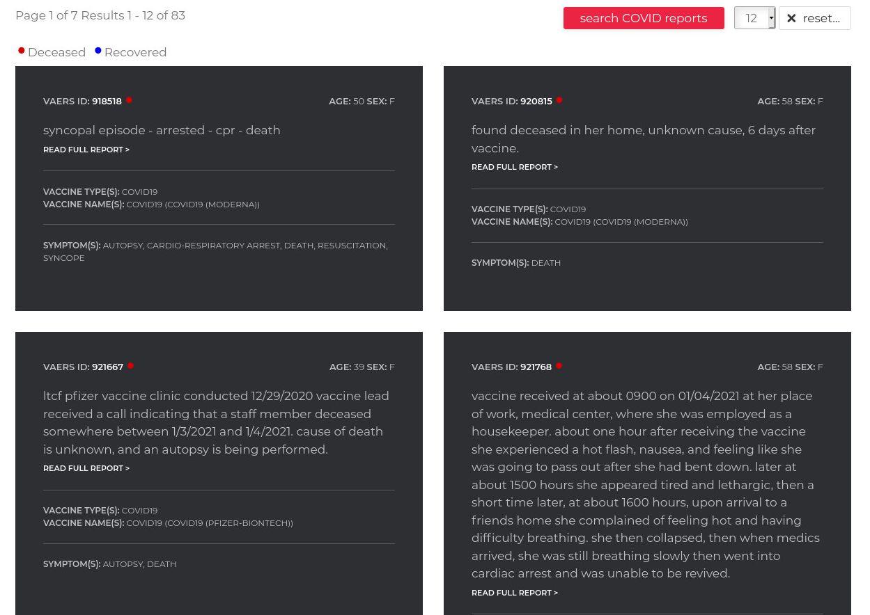 The statistics are being reported on a web site called OpenVAERS.com which provide a summary of all of the injuries and deaths that have been caused by the Moderna and Pfizer-BionTech vaccines to date, since the rollout began in the US a mere two months ago.